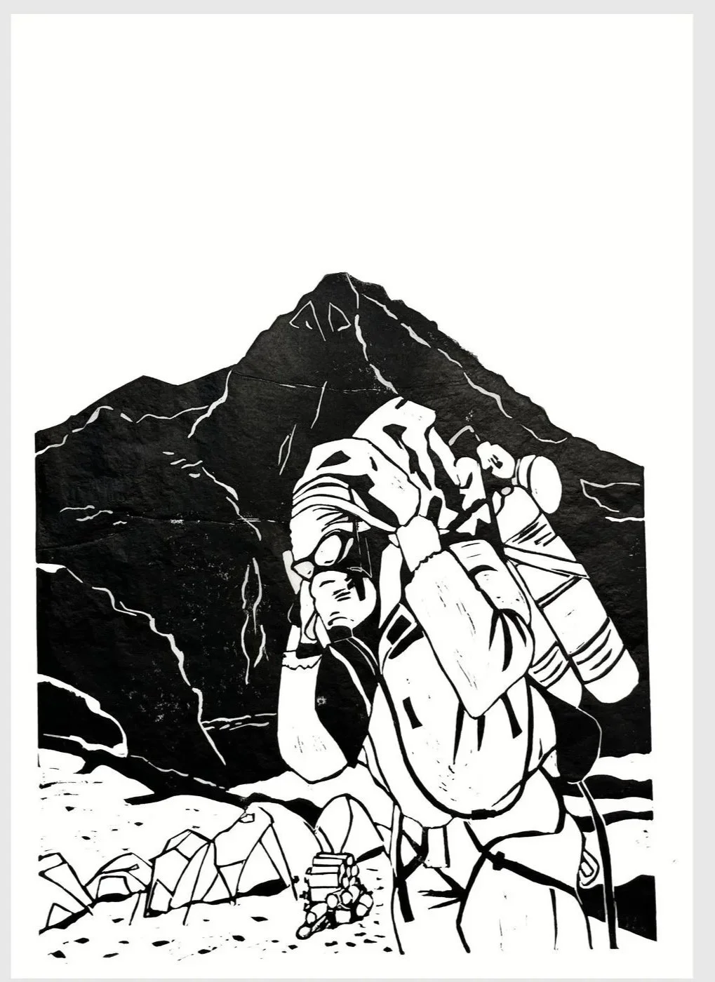 Die Linoldrucke untersuchen die Rückseiten von bekannten Bergspitzen. Wie sieht das Matterhorn von Süden aus? Was ist passierte bei der Erstbesteigung des K2s? Weshalb wurden die indigenen Ahwahneechees aus der Gegend rund um den El Capitan vertrieben? Wer schleppt die Sauerstoffflaschen am K2 in die Todeszone? Die A3 grossen Linoldrucke auf Seidenpapier zeigen die Fragilität der Bergwelt.